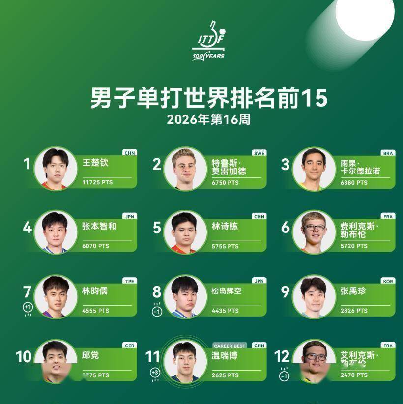 国际乒联最新公布的第16周世界排名,似乎也从另一个侧面印证了国乒男队面临的挑战。 在男子单打前十名中,中国选手仅有王楚钦和林诗栋两人。 王楚钦以超过第二名近5000分的巨大优势稳居第一,但在他身后,瑞典的莫雷加德、巴西的雨果、日本的张本智和等外协会高手紧追不舍。