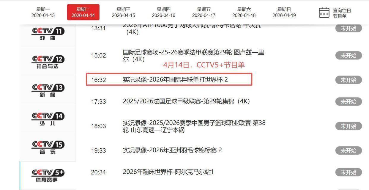 就在今晚,所有关注国乒的观众,都有机会在电视机前重温这对“顶峰同框”的冠军组合是如何一路过关斩将的。 根据中央电视台最新的节目安排,4月14日星期二晚间18点30分,CCTV5体育频道将播出“实况录像-2026年国际乒联单打世界杯 女单比赛”。 而在下午16点32分,CCTV5+体育赛事频道则会重播该赛事的部分精彩场次。 这意味着,球迷们可以再次欣赏到孙颖莎和王楚钦在澳门赛场上的夺冠之旅。