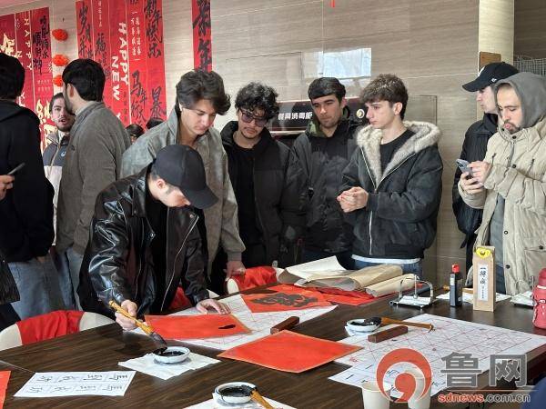迎新年,品非遗。现场,包饺子、剪纸、制作螺钿等特色非遗体验区前围满了外籍留学生,大家踊跃体验着不同的非遗活动。剪纸体验区,留学生们手拿一把剪刀,一张红纸,手指翻飞间,“福”“囍”等代表着吉祥寓意的图样跃然纸上;书法体验区,大家执笔挥毫书写着对未来的“福”愿,感受中国笔墨的独特神韵;茶艺体验区,大家则体验了中国传统茶艺,于一呼一吸间感悟东方哲学的宁静与雅致。