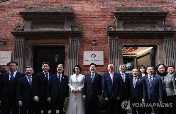 1月7日,在上海,韩国总统李在明(左六)和夫人金惠景(左五)到访大韩民国临时政府旧址。李在明在此处出席上海大韩民国临时政府设立100周年纪念仪式。韩联社