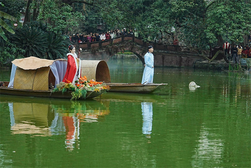 罨画池博物馆湖面波光粼粼,两艘装饰着诗词帷幔和花卉的大花船缓缓驶出。船头,身着古装的演员手持团扇,轻吟着陆游的诗句;船身两侧,彩绸随风飘动,与池中倒影交相辉映。