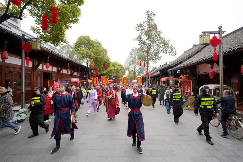 开庙典礼结束后,2026成都大庙会崇州罨画池文庙会拉开帷幕。状元主题巡游从大成殿出发。状元郎红袍加身、气宇轩昂,带领礼官、侍从、侍卫及学子队伍,更融入了正月民俗中的灶神、财神元素,一路浩浩荡荡穿行于罨画池历史文化街区。