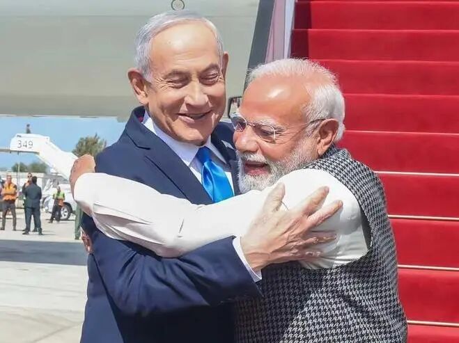 2月25日至26日,莫迪对以色列进行了访问,这是他第二次到访,也是其在巴以新一轮冲突爆发后的首次中东之行。莫迪专机抵达本·古里安机场时,以色列总理内塔尼亚胡夫妇亲自在舷梯下迎接,狠力的握手、热烈的拥抱展现了双方“亲如手足”的个人情谊。